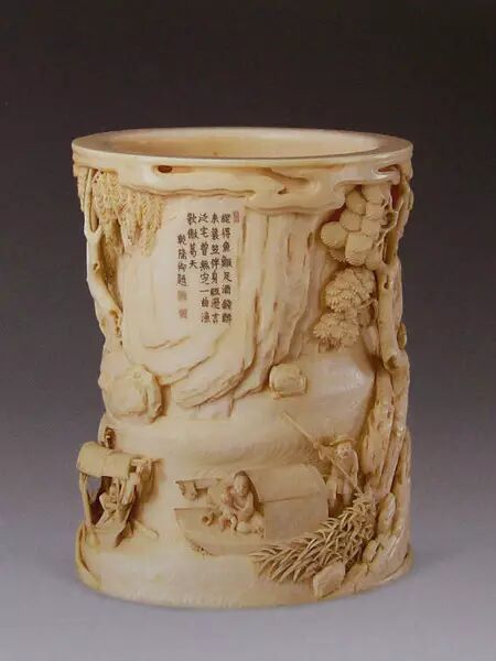 ▲清代象牙雕渔家乐图笔筒