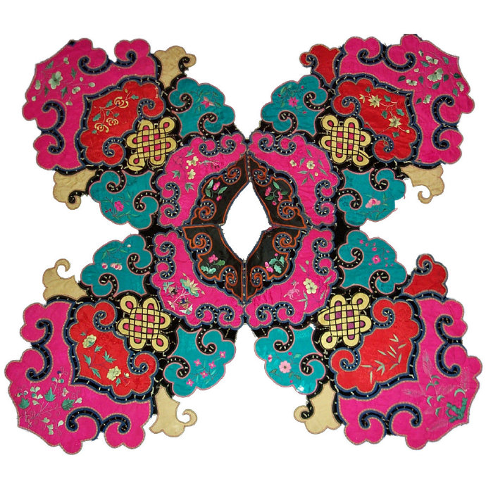 清代时期,祥云纹种类则更加丰富,在原有的祥云纹基础上,演绎出极具时代性的叠云纹。叠云纹以均匀细密的曲线、层叠重复的弧旋勾卷和自由多变的组合形式,创造出独特的铺陈繁复的风格特色。整体形态在保持平面化结构的基础上,又增加了祥云纹的立体感。构图丰富,多为复合型图案样式。