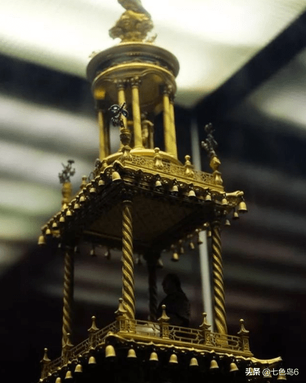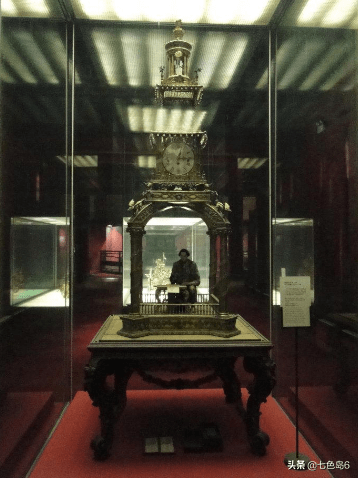 这钟当年由英王送给清廷,钟型为铜镀金四层楼阁。顶层圆形亭内,有两人偶可以在启动后,来开上书“万寿无疆”四字的卷轴。第二层是钟的计时部分。第三层有一敲钟人,每逢报完三、六、九、十二时后,便打钟碗奏乐。