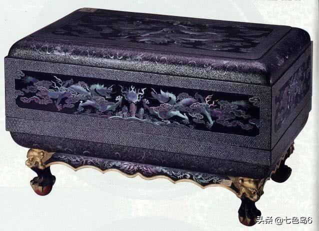 故宫博物院藏琉球王国(今日本冲绳)进贡的螺钿器,共有长方大匣、圆盘、盖碗等三百余件。其开片技术高超,螺钿片大而平,嵌饰的图案接缝相对较少,显得规整而不琐碎。螺钿片与地漆结合紧密,平滑如镜,嵌饰的图样轮廓清晰,色泽明艳,虽历经数百年,仍如新制。