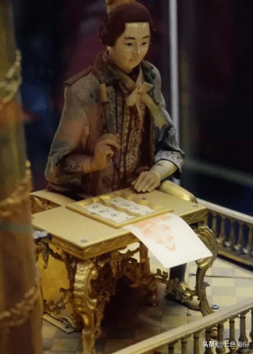 它的底层九是那个妇孺皆知的写字机械人——一个白人绅士人偶,单腿跪地,一手扶案,绝对是顶级复杂的设计,只需给毛笔沾上墨水上弦开动,写字人便在面前的纸上写下“八方向化,九土来王”八个汉字,字迹工整有神笔锋清晰。写字的同时,机械人的头随之摆动。它与计时部分机械不相连的,是一套独立的机械设置。