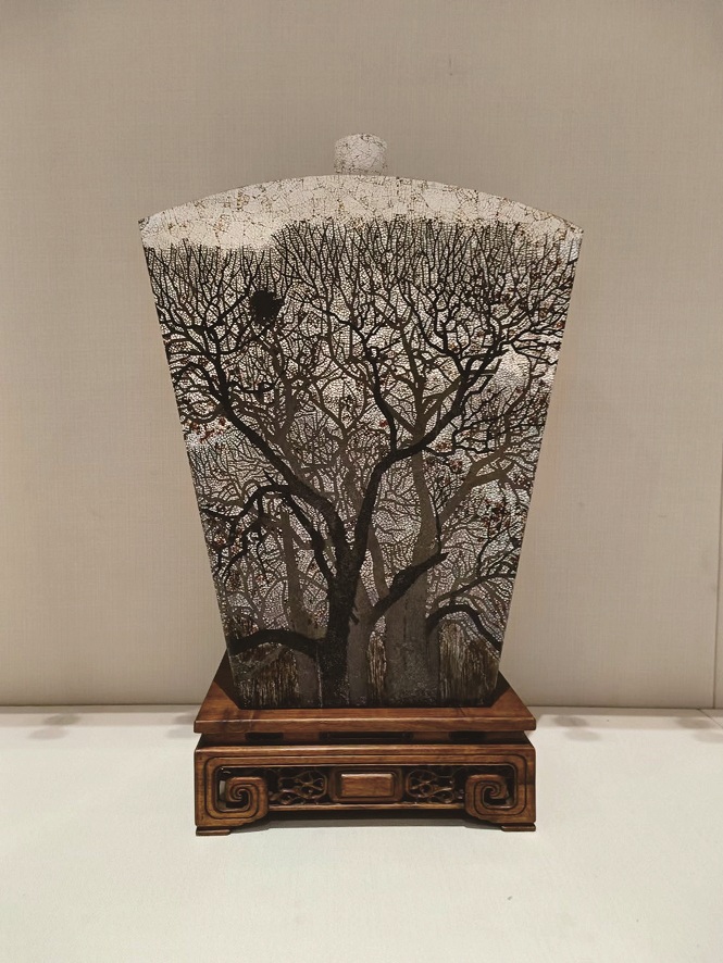 在《洛神》系列、《鹤》系列等作品中,薛晓东打破中国绘画“散点透视”的传统,大胆运用“焦点透视”,既追求中国画的“重神不重形”“形神兼备”,即“心象”,又追求西画的“视觉真实”“科学性”,即“物象”,成功实现两者的有机统一。此次展出的漆宝瓶《惊蛰》是薛晓东将传统工艺与现代美学理念融合的代表作。作品在工艺上采用蛋壳镶嵌,通过不同蛋壳的色泽呈现出树枝自然的色彩变化,通过蛋壳的纹理使树木的造型更为艺术,鸭蛋壳的运用则很好地表现出树的背影、隐隐约约山的轮廓,使得画面丰富而富有层次,呈现出初春大地万物苏醒、鸟儿欲出巢,一派勃勃生机的景象。
