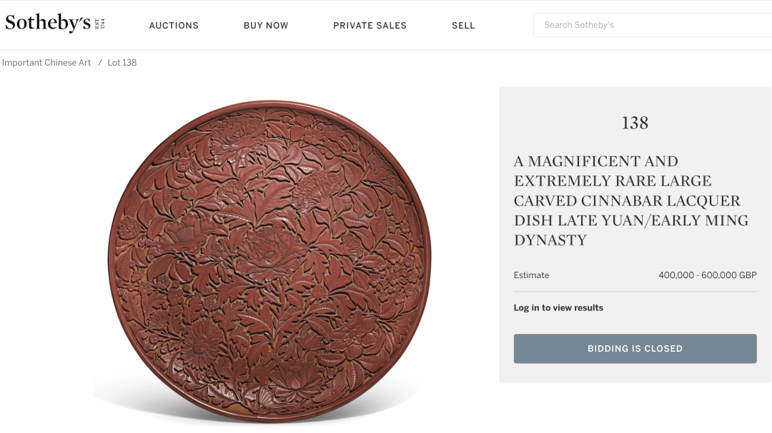 2017年5月10日,伦敦苏富比上拍了一只元末明初的剔红花卉纹大盘,成交价达到了惊人的156.875万英镑,约合人民币1400万。