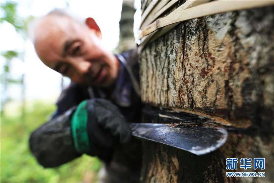 漆农余忠鼎在割漆(2020年8月21日摄)。新华网发(王纯亮 摄) |