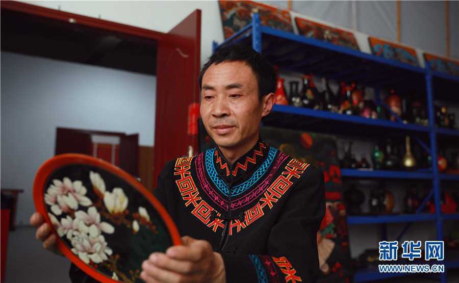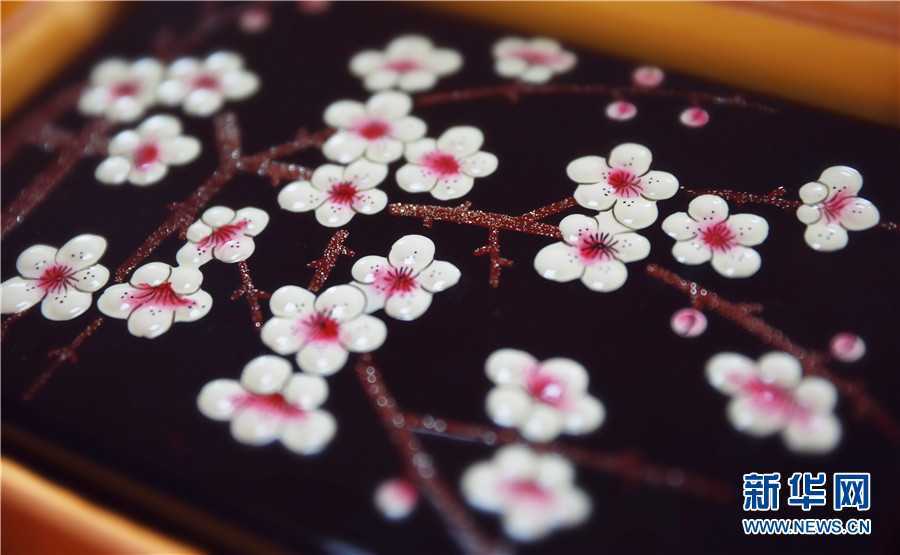 工人展示大方漆器的蛋壳镶嵌工艺(3月31日摄)。新华网 卢志佳 摄
