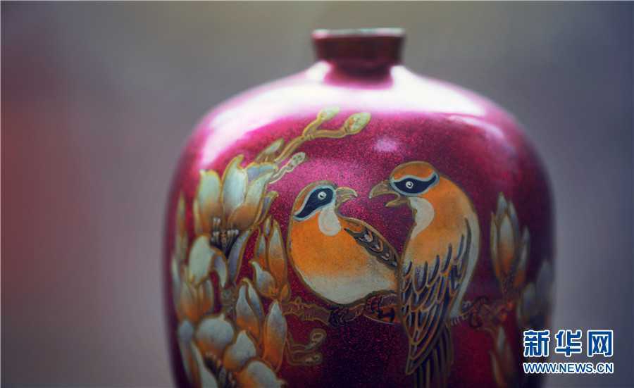 工人在经过漆地的瓶子上作画(3月31日摄)。新华网 卢志佳 摄
