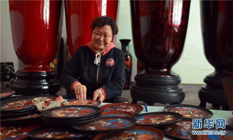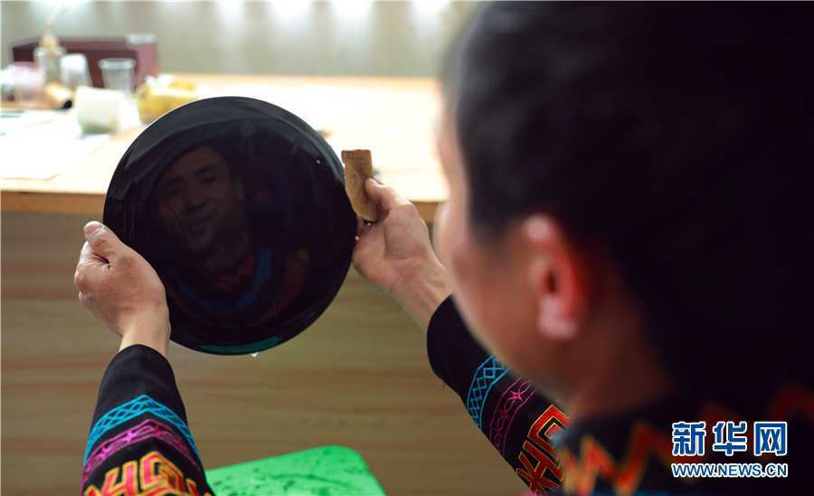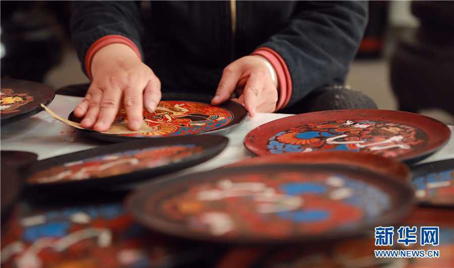 大方县高光彝风漆器工艺制品厂的工人正在打磨上了漆的盘子(3月31日摄)。新华网 卢志佳 摄