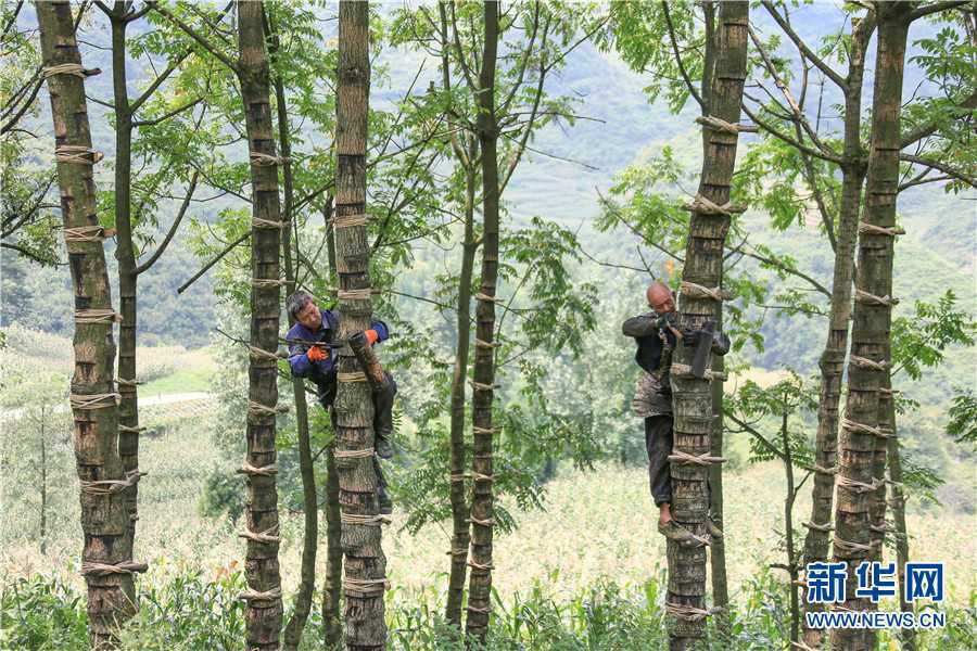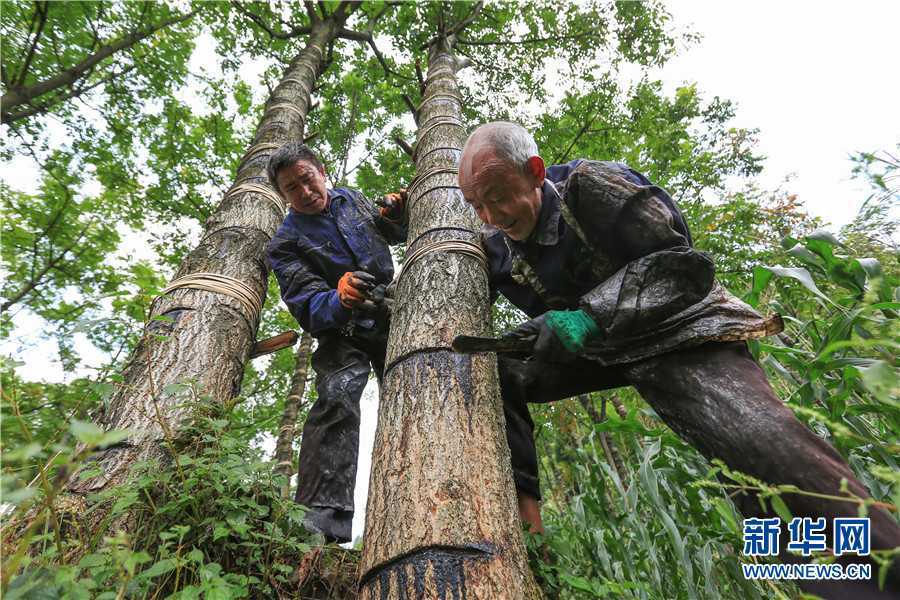 漆农余忠鼎(右)和余忠平在贵州省毕节市燕子口镇大南山村割生漆(2020年8月21日摄)。新华网发(王纯亮 摄)