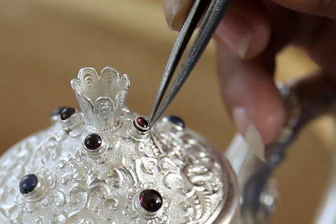 花丝镶嵌是一门传统的宫廷手工技艺,主要使用金、银等材料,通过镶嵌宝石、珍珠或编织等工序,制作成工艺品。花丝镶嵌工艺复杂,大致可分掐、填、攒、焊、堆、垒、织、编八种手法,技艺精湛,造型优美,花样繁多,具有传统的艺术特色。花丝镶嵌产品一般分为两类:一是花丝,即把金、银抽成细丝,用堆垒、编织等技法制成工艺品;二是镶嵌,即把金、银薄片锤打成器皿,然后錾刻图案,镶以宝石、珍珠。