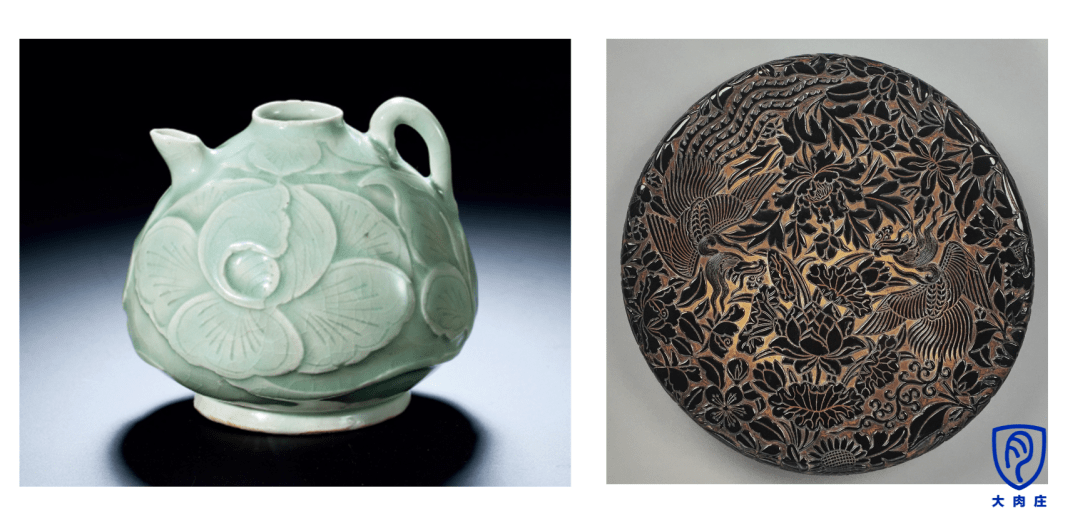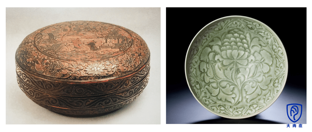 雕漆既然名字里有个“雕”字,首先可以肯定的是,这类漆器是用器具“雕刻”而得的;再往深入的地方想一想,适合做“雕工”的器物,那么必然有着较厚的胎体。所谓真相只有一个,我们不难推断出,雕漆上凹凸感极强的装饰,无疑启发了正在发愁给陶瓷做何装饰的瓷工。