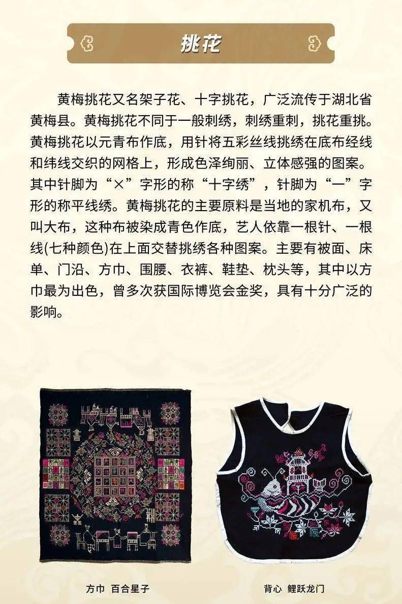 黄梅挑花又名架子花、十字挑花,广泛流传于湖北省黄梅县。相传黄梅挑花起源于唐宋时期,成熟于明末清初。长期以来,经过一代又一代农家妇女的精研细作,这门工艺日臻完善,以明快的色彩组合、精巧的图案构想凸显出独特的艺术表现力。