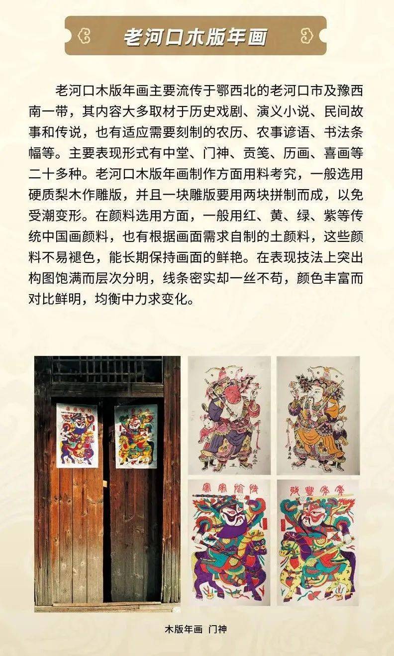 老河口木版年画主要流传于鄂西北的老河口市及豫西南一带,明末清初时,木版年画就在老河口牢牢扎根,清代乾隆至光绪年间尤为兴盛。老河口木版年画的内容大多取材于历史戏剧、演义小说、民间故事和传说,也有适应需要刻制的农历、农事谚语、书法条幅等。其寓意“喜庆吉祥”、“辟邪纳福”的作品有《门神》《和合二仙》《一团和气》《麒麟送子》等。还有表现历史上的英雄人物如岳飞、郑成功、孟良、焦赞等。主要表现形式有中堂、门神、贡笺、历画、喜画等二十多种。