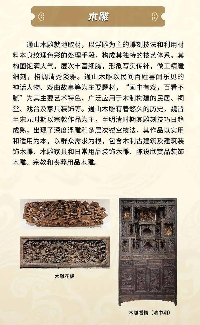 通山木雕有着悠久的历史,魏晋至宋元时期以宗教作品为主,至明清时期其雕刻技巧日趋成熟,出现了深度浮雕和多层次镂空技法,其作品以实用和适用为本,以群众需求为根,包含木制古建筑及建筑装饰木雕、木雕家具和日常用品装饰木雕、陈设欣赏品装饰木雕、宗教和丧葬用品木雕。