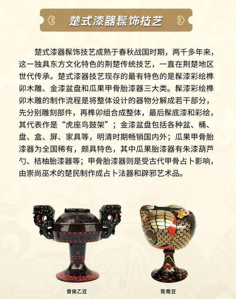 楚式漆器技艺经历朝历代承传流变,现存最有特色的是髹漆彩绘榫卯木雕、金漆盆盘和瓜果甲骨胎漆器三大类。髹漆彩绘榫卯木雕的制作流程是将整体设计的器物分解成若干部分,先分别雕刻部件,再榫卯组合成整体,最后髹底漆和彩绘,其代表作是“虎座鸟鼓架”;金漆盆盘包括各种盆、桶、盘、盒、屏、家具等,明清时期畅销国内,远销海外;瓜果甲骨胎漆器为全国稀有,颇具特色,其中瓜果胎漆器有朱漆葫芦勺、桔柚胎漆器等;甲骨胎漆器则是受古代甲骨占卜影响,由崇尚巫术的楚民制作成占卜法器和辟邪艺术品。