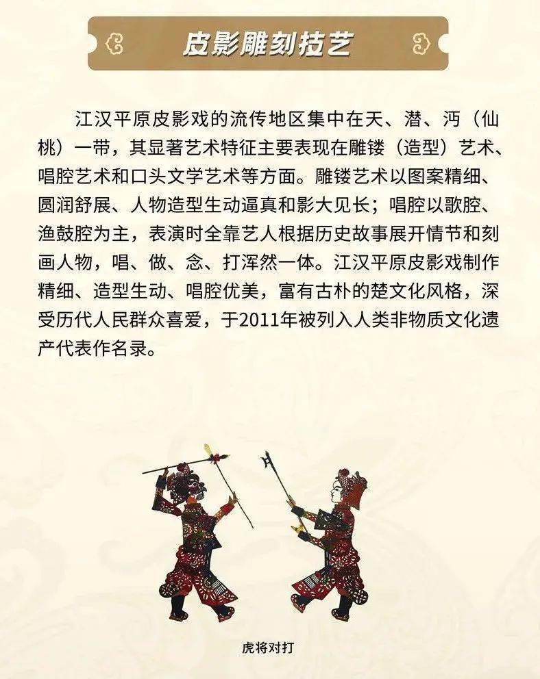 江汉平原皮影戏演唱的剧目达300多个。这些剧本实际上只有剧目的条文,在表演时全靠艺人根据历史故事展开情节和刻画人物,唱、做、念、打浑然一体,其口头文学艺术形式是江汉平原皮影戏的又一主要特征。江汉平原皮影戏制作精细、造型生动、唱腔优美,富有古朴的楚文化风格,深受历代人民群众喜爱,于2011年被列入人类非物质文化遗产代表作名录。