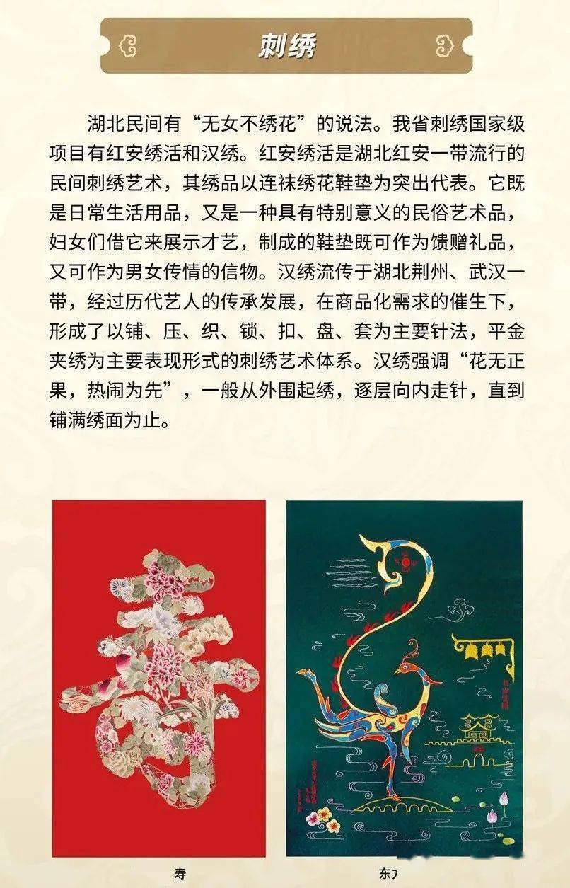 湖北民间有“无女不绣花”的说法。绣娘云集的集镇,往往被冠以“绣”名,如汉口的“绣花街”,洪湖的“绣花堤”,石首的“绣林镇”等。我省的刺绣国家级项目有红安绣活和汉绣。