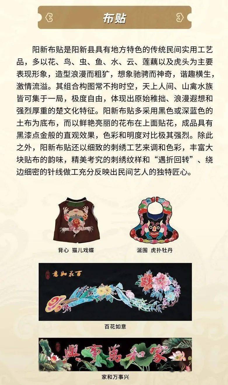 阳新布贴是阳新县具有地方特色的传统民间实用工艺品,多以花、鸟、虫、鱼、水、云、莲藕以及虎头为主要表现形象,造型浪漫而粗犷,想象驰骋而神奇,谐趣横生,激情流溢。其组合构图常不拘时空,天上人间、山禽水族皆可集于一局,极度自由,体现出原始稚拙、浪漫遐想和强烈厚重的楚文化特征。
