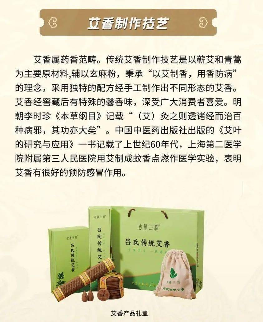 艾香属药香范畴。传统艾香制作技艺是以蕲艾和青蒿为主要原材料,辅以玄麻粉,秉承“以艾制香,用香防病”的理念,采用独特的配方经手工制作出不同形态的艾香。艾香经窖藏后有特殊的馨香味,深受广大消费者喜爱。