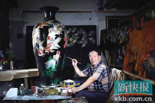 与一般的工作室里安静的氛围不同,陈其积的漆画工作室里颇为热闹。陈其积和七八个年轻人各自在创作,有的在画花瓶,有的在描屏风;有的作品快完成了,有的则刚开笔。其间,师生们不时停下来讨论:“这条线可以弯一点,效果更飘逸一些。”“这个位置上可以多画一条金鱼,让它回头看,更饱满些,也会更生动。”