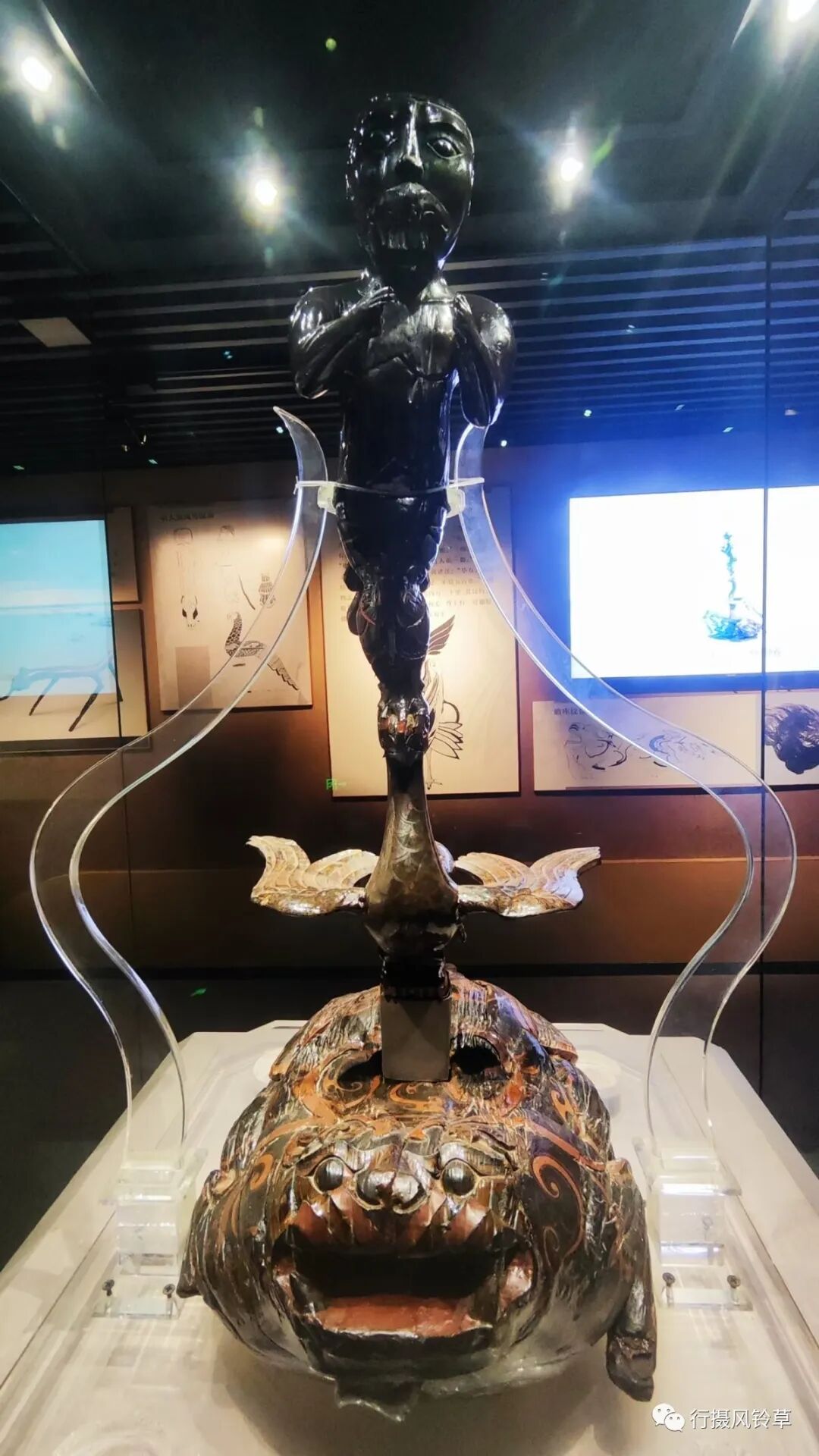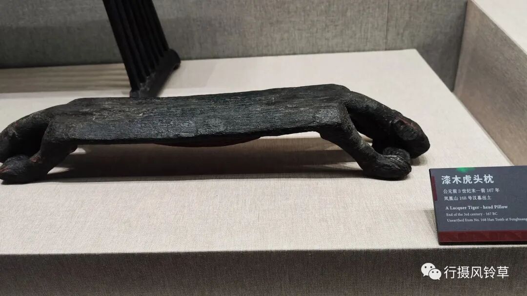我在“遂先生”馆里看到一个的虎头枕,它用整块木雕成,两端各有一个虎头,虎口咬住一横木,前后爪特别有力抓住横木,虎枕上涂黑漆,因年代久远,木枕上已有很深的裂痕,我站在虎头枕前,观察了很久,此前,我在很多博物馆看到过名目众多的瓷枕,但这样的木枕是第一次。没想,在“丹漆神韵”展厅里,我又见到一个涂黑漆的雕豹枕,想想真有意思,大约古人是为了能睡个好觉,在枕头上雕虎雕豹,让它们来保护自己。