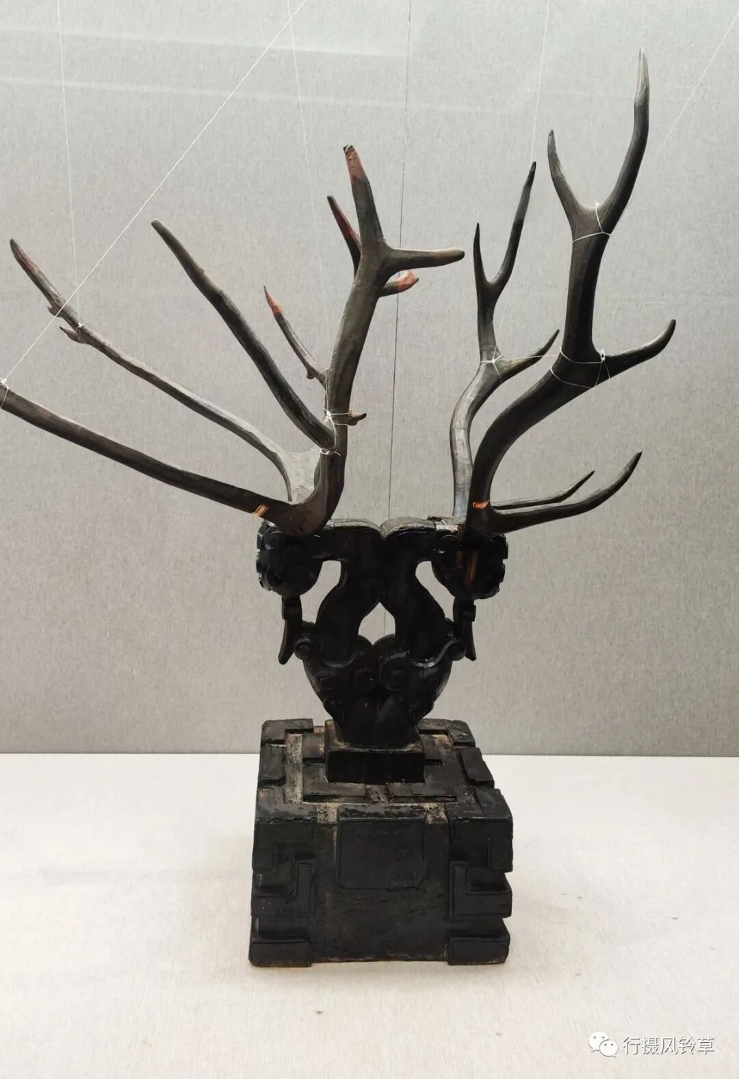 镇墓兽大部分都是由底座、头身和鹿角三部分组成,这是楚墓镇墓兽的传统风格。不管中间身躯如何变化,最上端的鹿角是必须有的。楚国产麜鹿,被楚人视为神灵瑞兽,楚人将其用在镇墓兽上,希望它能用尖锐的鹿角,驱赶来自阴间的恶魔。