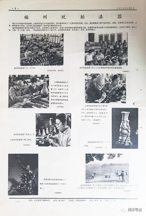 《新闻照片》是由新华通讯社出版的资料性报纸,每期设有4个版面。在1973年4月5日第2880期推出《福州脱胎漆器》专版,刊登了一组介绍福州漆器的照片及文字说明。
