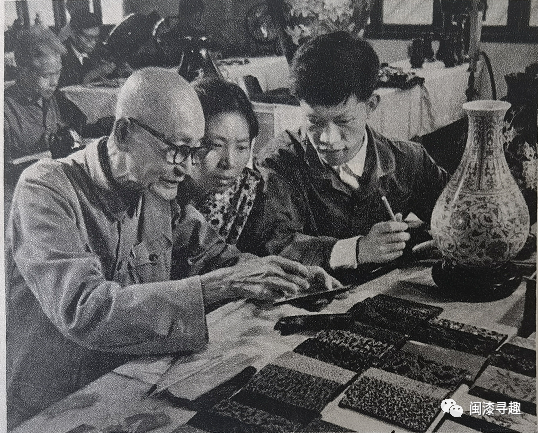 接下来刊登的是有关漆艺大师李芝卿的两张照片,第一张照片文字说明为:“从事脱胎漆器生产50多年的老工人李芝卿向青年工人传授脱胎漆器装饰工艺方面的技巧,桌上摆的是他多年搜集的各种脱胎漆器的装饰样本”。这里提及的装饰样本,是李芝卿在1966年创作完成的百余块“漆艺(饰)样板”,色纹奇巧,变幻无穷,集合了李芝卿装饰技法的精华,为后人留下了一份珍贵的文化遗产。