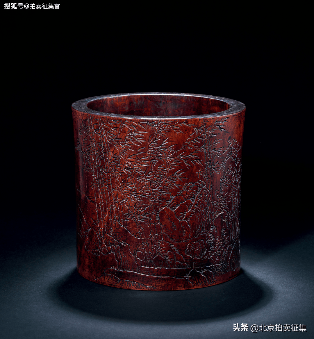 朱稚征,号三松,为小松仲子,是明代嘉定派竹刻创始人朱鹤之孙。嘉庆帝对朱三松的作品也是情有独锺,尝题「传神只作萧疏笔,经久由来以朴存」。竹雕器作为笔筒之大宗,以其材质虚心劲节之性颇合文人雅趣,常用以表现文人隐逸之情怀。其时,竹刻名家辈出,竹雕笔筒亦为世人推崇,可为繁盛一时。