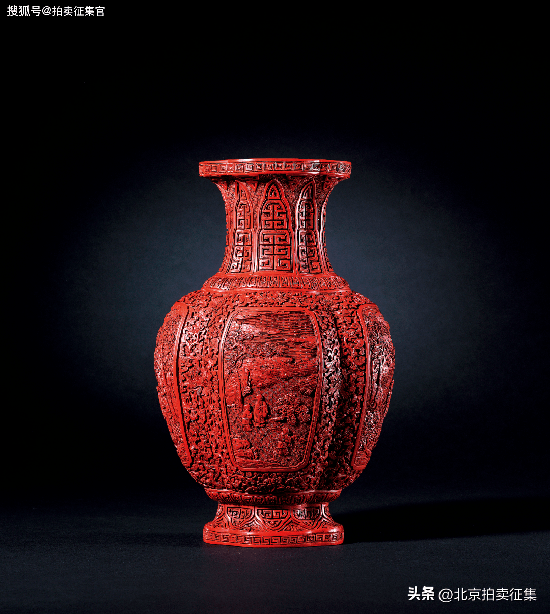 18世纪 宫廷剔红雕漆山水人物海棠式瓶
