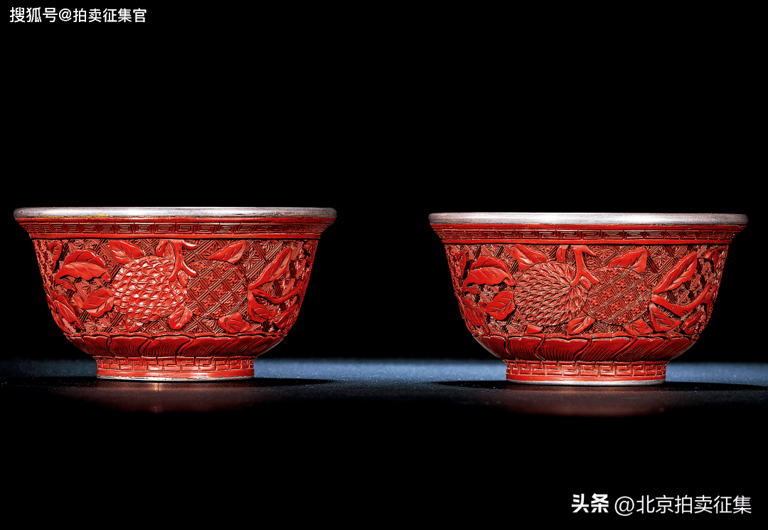 说明:本品碗呈圆形撇口,弧壁下敛,底承圈足,造型端庄典雅,周正规矩。内壁及底以银镶之,外壁以剔红工艺装饰,口沿和圈足饰回纹一周,足胫处饰变形莲瓣纹,腹部主体纹饰以锦纹地子上剔刻荔枝纹样,荔枝枝叶翻卷,枝干柔韧,荔枝果实硕硕,极为悦目,并填以不同锦纹,寓意吉祥。整器雕刻刀法有力,层次清晰,间隙处理得当。因荔枝利及财富,寓意极好,富自然意趣寓意「一本万利」,而成为当时的经典装饰题材。本品雕漆技法娴熟,刀锋隐起圆润,漆色红颜夺目,包浆莹润细腻,使人望之便觉典雅之至,赏心悦目,极为喜人,成对保存极为难得。