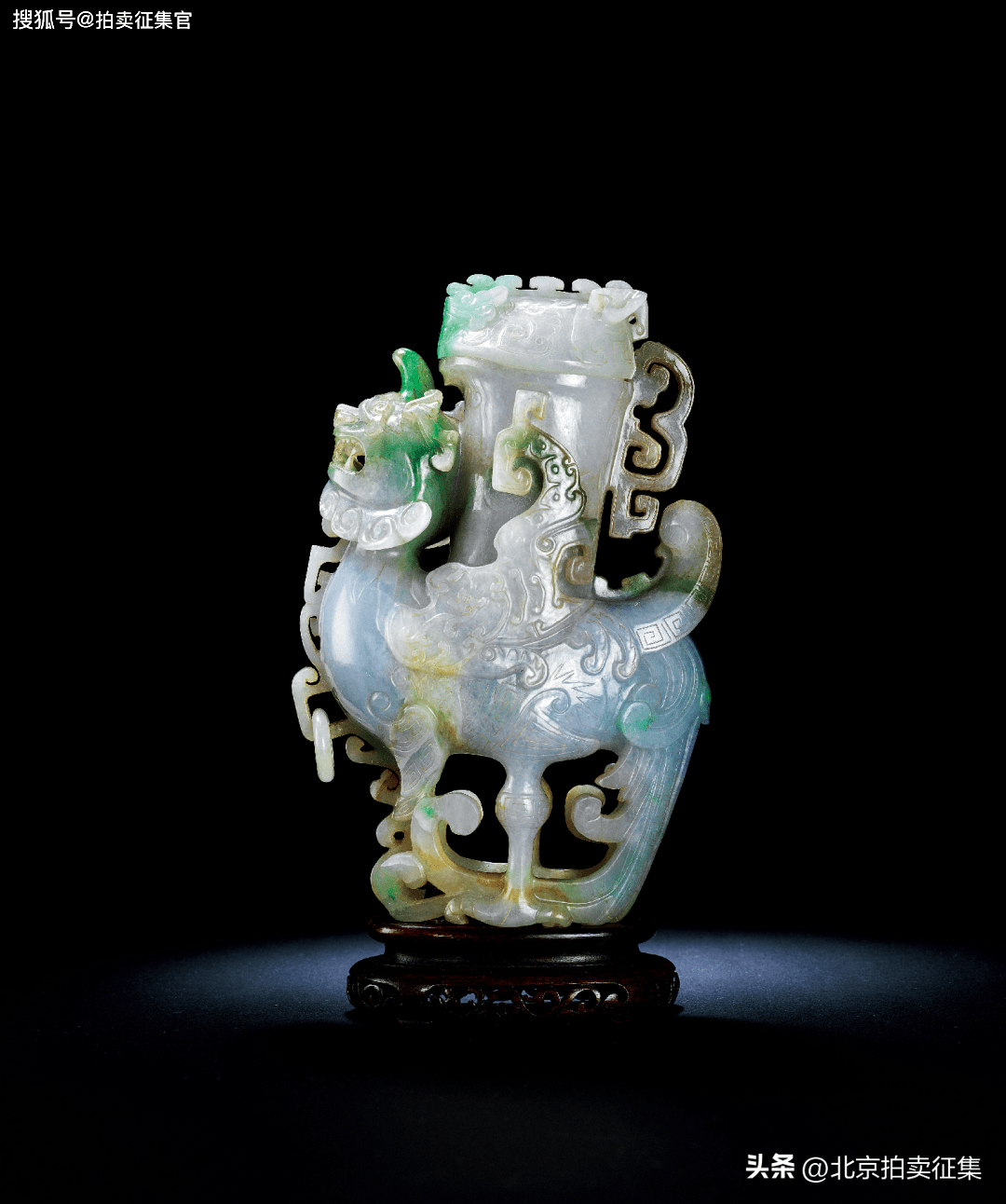 说明:拍品以三色翡翠为材,所选用翡翠石料质地坚密均匀,通体呈紫罗兰色,局部带有黄绿翡巧色,予人古朴肃穆之感。雕以甪端之形,目视前方,四足健硕,踞地有力,长尾蜷曲,肌肉遒劲,体态矫捷灵动,孔武有力,颈部下垂吊一玉雕活环,构思巧妙,腹背满饰云纹及回纹等纹饰,上有起脊兽面纹盖扣合,盖沿曲线流畅。整器效法商周青铜纹饰,立体感颇强,刻工流畅精细,包浆厚实凝重,形制古朴中具隽秀,足见皇家气象。本拍品用翠代青铜,以商周青铜器为范,结合宫廷造办处顶级玉雕工艺,堪称摹古创新之精品。