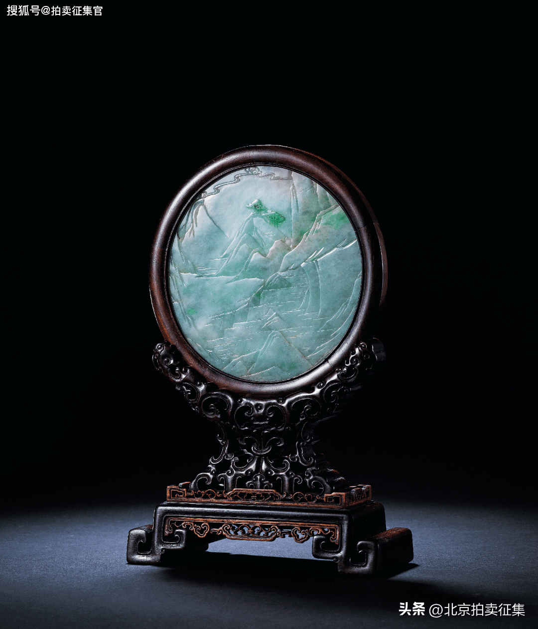 说明:此翡翠插屏取材圆形,工料具佳,双面浅浮雕五老观画图,插屏画面布局紧凑,雕工细腻,刻画逼真,抛光精细,实为隽品。屏座以红木嵌黄杨镜架,工艺繁复而精美,与浅色翡翠搭配,相得益彰。