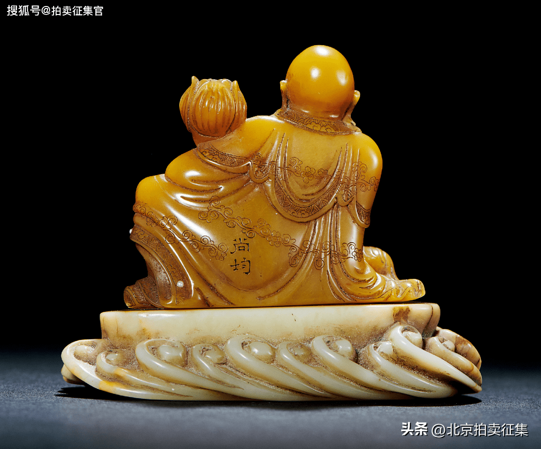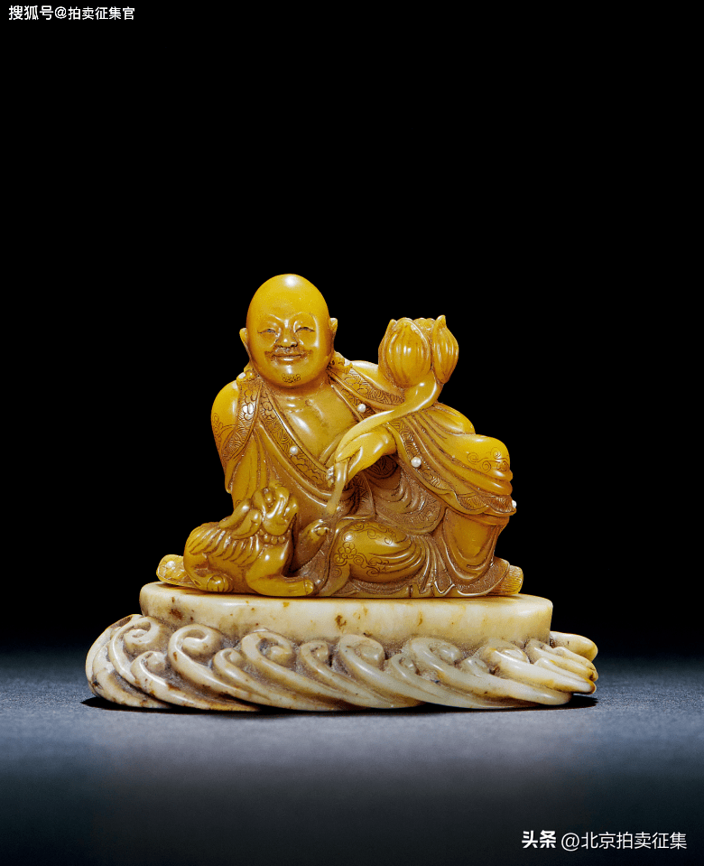 说明:本尊罗汉像选取上等田黄石依型雕琢而成,石材通身娇黄莹润。圆雕伏虎罗汉,神态安逸肃穆,法相庄严。侧身而坐呈倚靠姿态,一只小螭虎则趴在罗汉脚边,温顺可爱。背后刻有「尚均」二字款识。底座呈波浪状,与罗汉造型搭配协调,别有一番韵味。因田黄珍贵稀少,雕刻时尽可能减少其损耗,因此在选材,构思,色彩展现上极见功力,展现了雕刻大师常年积累的深厚底蕴。
