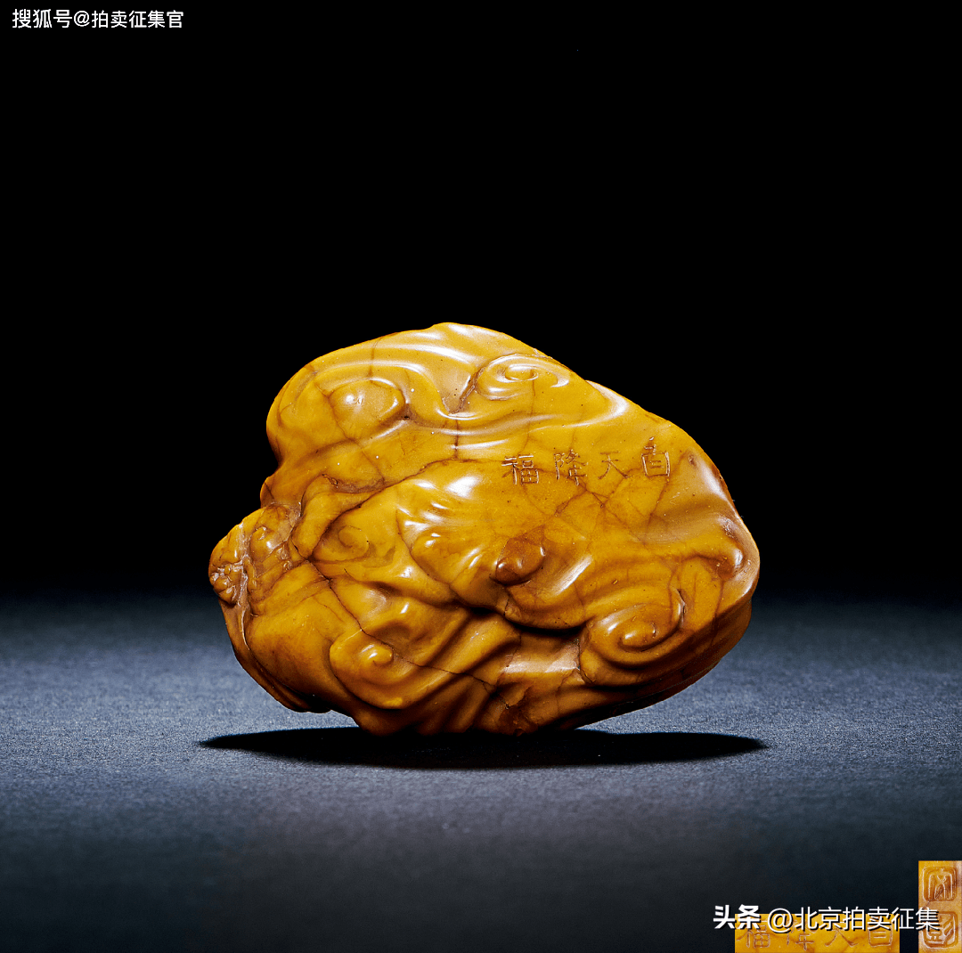 说明:此件寿山石田黄手暖随型雕刻,其上以刻划工艺雕琢卷云纹,纹饰流转如烟雾缭绕,流畅缥缈,一侧琢「自天降福」四字,一侧为「文」「彭」二章。本品技法精湛,造型精准,线条细腻。所取寿山田黄石质地细腻温润,色泽纯正厚实、凝莹若冻、温润可人。