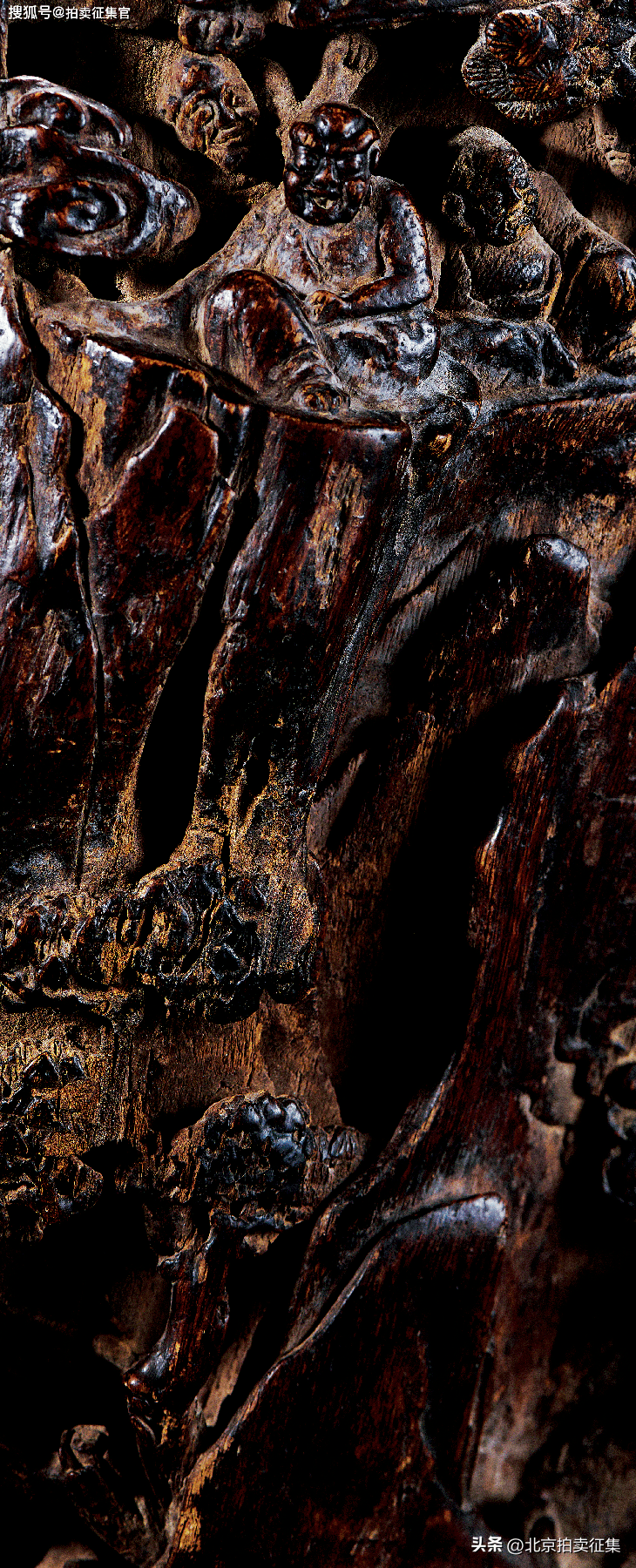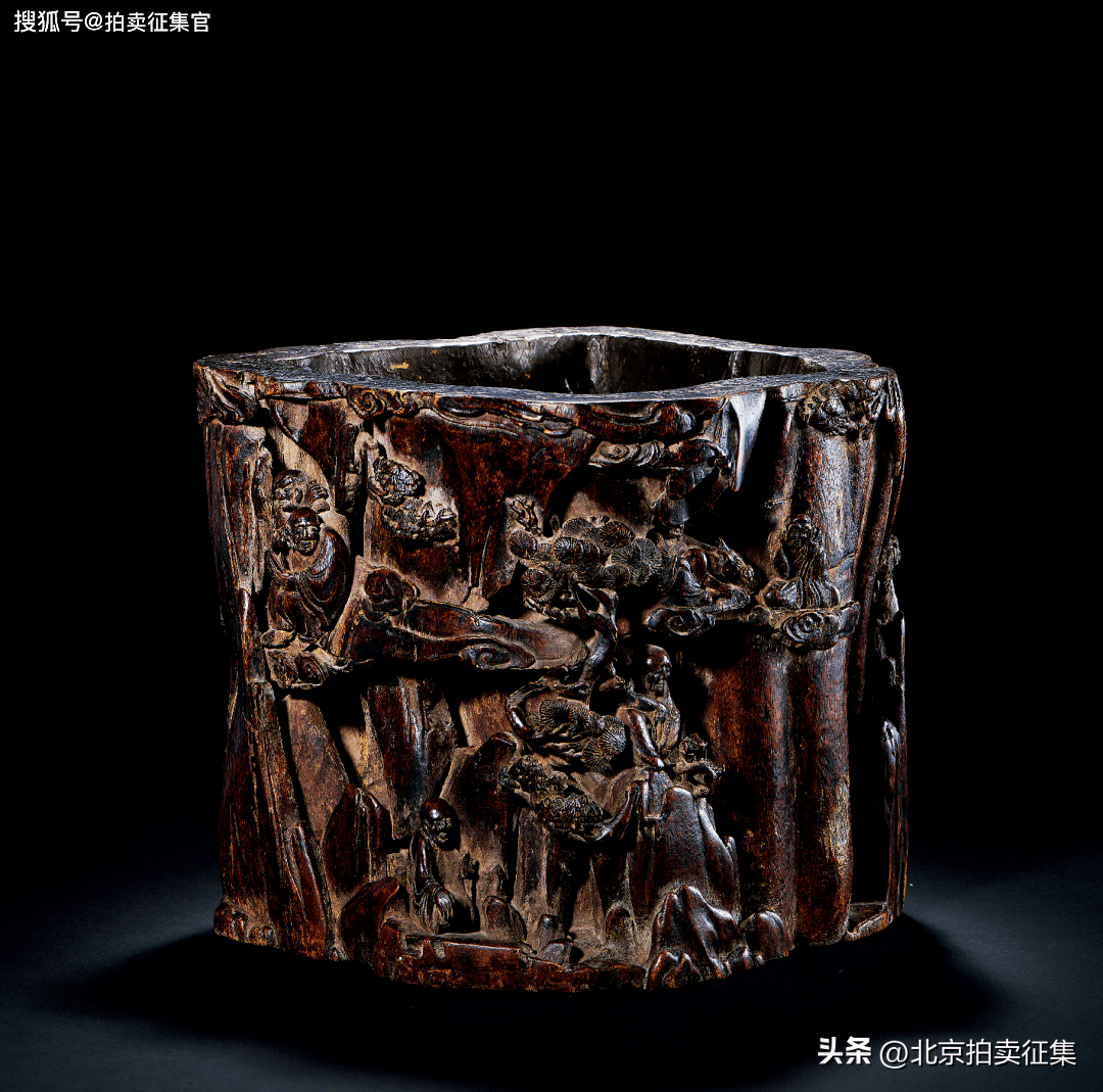 说明:沉香,又名「沉水香」,「水沉香」,古语写作「沈香」(沈,同沉)。古来常说的「沉檀龙麝」之「沉」,就是指沉香,沉香自古以来即被列为众香之首。沉香雕十六罗汉笔筒以沉香制成,此笔筒雕工精而美,线条凌厉,层次分明,是一件值得收藏的珍品。