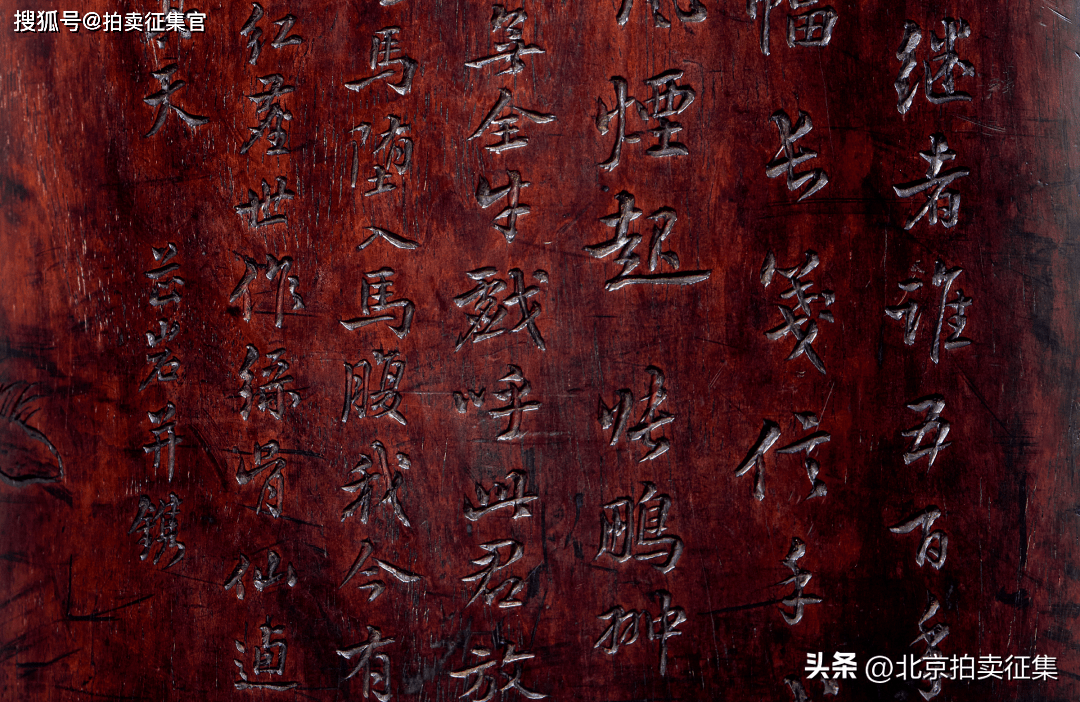 说明:笔筒取黄花梨大木为之,材料难得。黄花梨色泽沉敛红润,文理美观,包浆厚重。刻竹石图于其上,山石稳盘于地,竹叶似飒飒而动,构图简练,刀法老辣,气韵天成。侧行书刻诗文两首,落「张鹏翀」、「芷岩并镌」款。诗文平地深雕,类似刻碑,而以阴刻技法所雕剔之竹石,似不用稿本,一气呵成,竹叶迎风摇曳,似可闻沙沙之声,连无形的风都似乎跃然图上。此件笔筒为目前所见周芷岩所制题跋最长、体量最大、品质最精之作。其无论从布局能力,雕刻技巧,还是文化内涵都是一件无可挑剔的杰作,当为周芷岩艺术成熟期的代表作,极富南宗画意和文人气质。