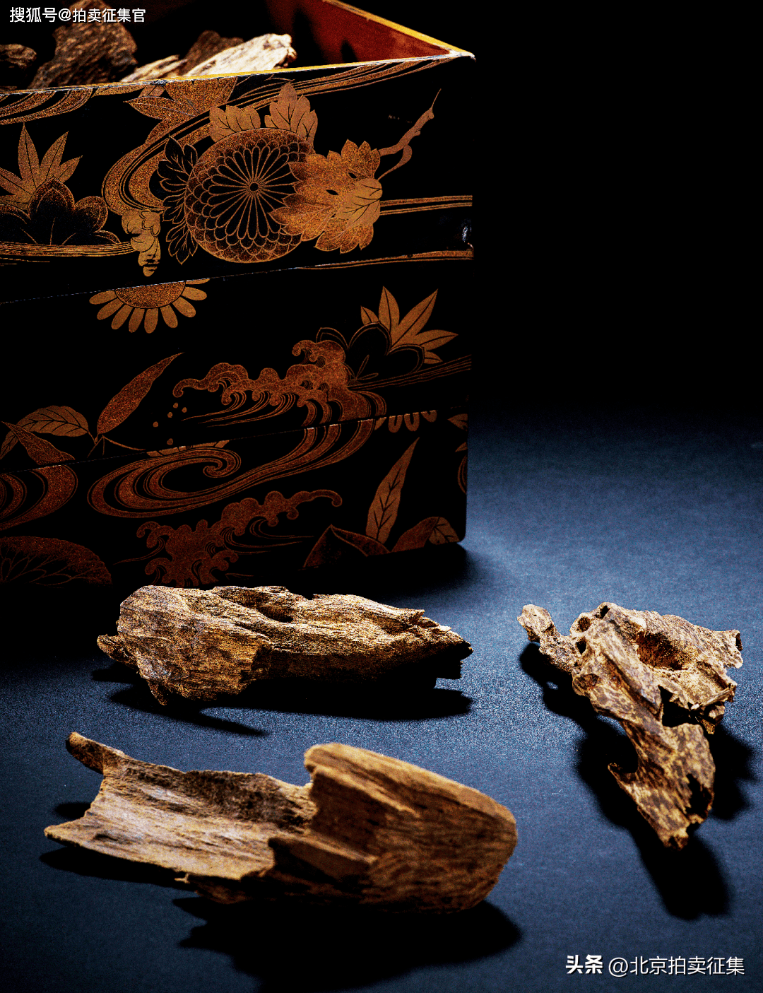 说明:沉香自古以来即被列为众香之首。香道在我国历史悠久,后传入日本,成为风尚。日本足利义政时期的三条西实隆、志野宗信、村田珠光等人将香木分为六国五味,此件沉香料即六国中「真南蛮」沉香,气韵浓郁明显,味道香醇绵长,且数量众多,十足珍贵,是难得的收藏佳品。存放小块沉香木材之盒为日本莳绘盒。香盒以平莳绘技法,用金粉莳晕流云、花卉、竹、樱等事物,淡雅而优美,精巧而华丽,表现出一种「大和的美」,体现着日本特有的审美情趣。