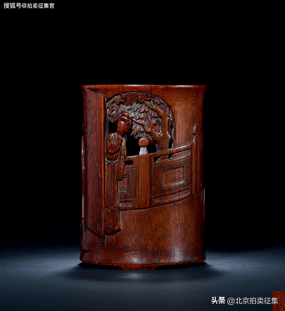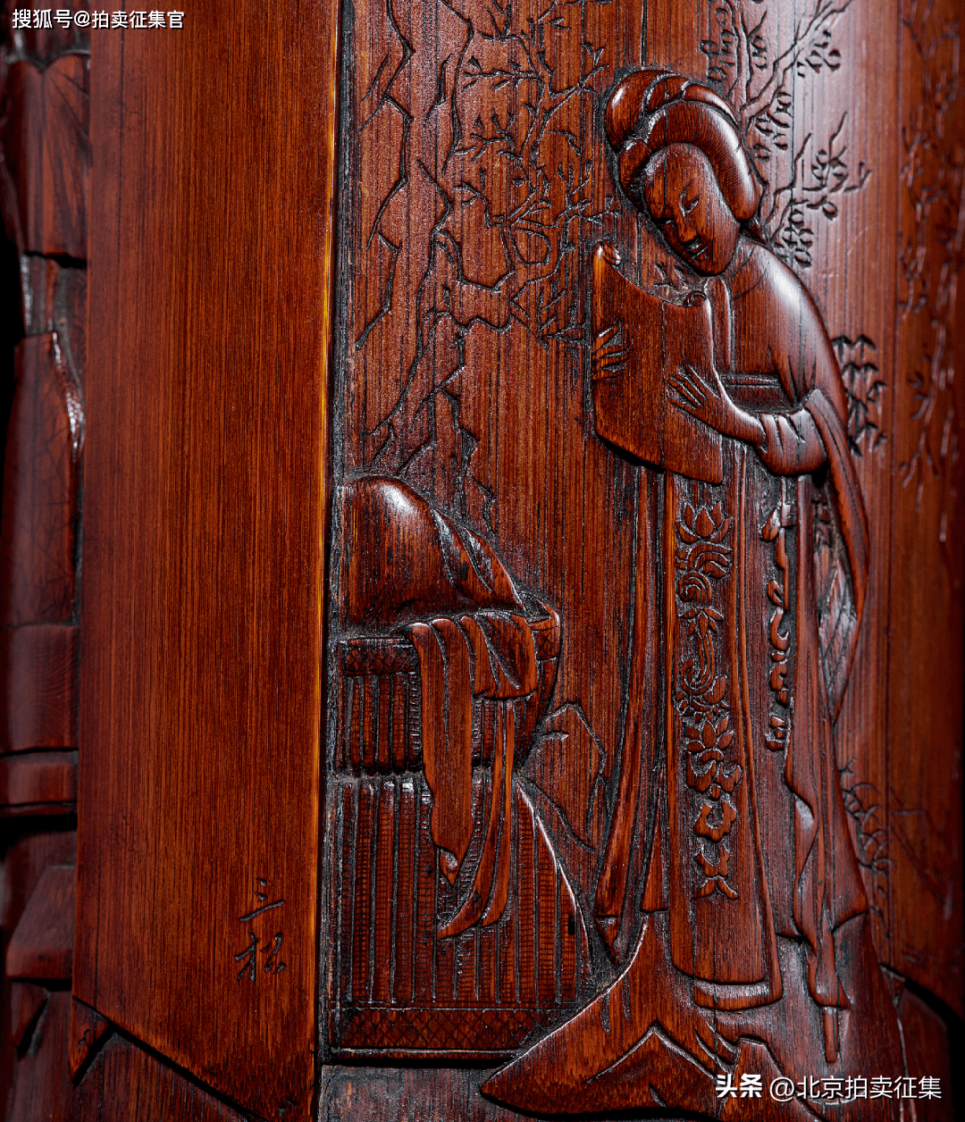 说明:笔筒以横云烟岚交织新月梧桐为背景,玲珑湖石矗立,又有曲栏饶台,以剔地深刻手法雕二乔拜月,二乔着霓裳珠玉,膜礼拜月,其仪态万方,婉约秀美。雕法精细,错落有致,场景丰富,颇有画意。笔筒泛红褐色,包浆厚重。山石枝叶间阴文雕刻隶书「三松」款,结字方正有力。