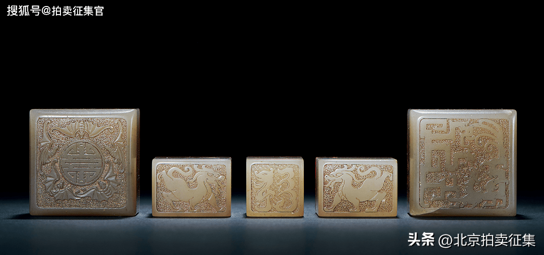 说明:此拍品一套共五方印章,均以寿山优质冻石为材作矩形印,侧边饰一周回纹,其大小不一,雕琢各异,颇有意趣。两方大印其一雕五福捧寿纹,五蝙蝠围绕寿字飞舞,是为多福多寿,寓意美好;另一方琢拐子龙纹,其线条挺拔、硬朗,转折处呈圆方角,两龙头部亦呈方圆形,侧面有题款,为赠万亭兄所制。两长方形印形制相似,不同之处仅为章面纹饰呈镜面相对,均雕一麒麟呈昂首漫步状,常用来比喻杰出之人。一方形印体量最小,上雕福字纹。五方印章随形配带一红木盒,品相完好,木纹梳理。