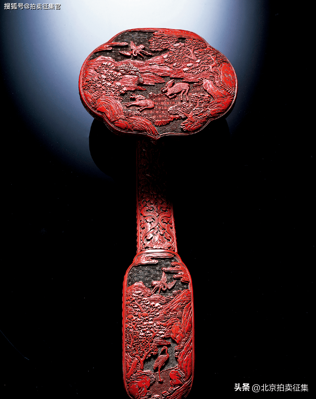 说明:本品造型规矩典雅,落落大方。漆色红润纯正,雕工娴熟,刀工细腻,运刀如笔,时代特征鲜明。如意首作海棠式,柄身随形隆起,中部略宽,如意首内剔鹤鹿同春,中部雕松竹仙鹤,下部雕松柏仙鹿,柄身处剔缠枝莲。整器山石皴皱、松针如芒,鹤鹿灵动,整体线条犀爽,刀工流畅、打磨圆润,纹饰寓意祥瑞。