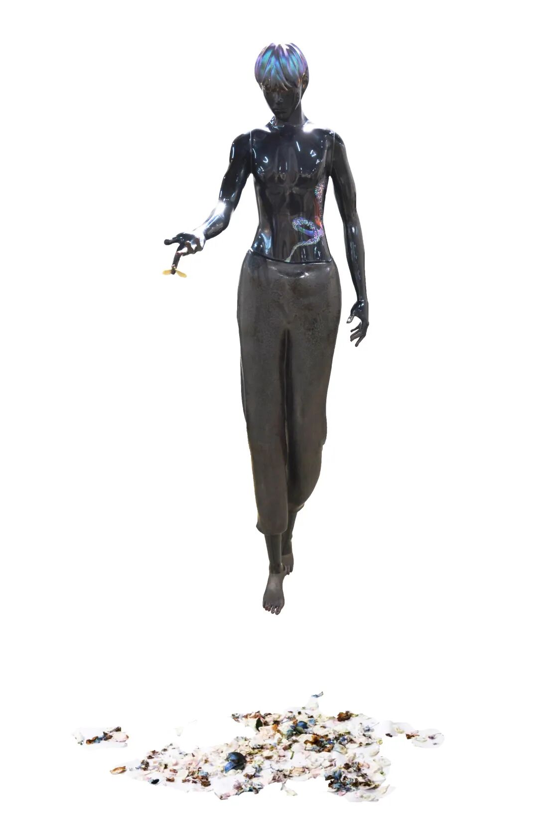 以“雕刻木胎人体”和“漆艺脱胎”花瓣、花苞的造型拼接;用漆艺的方式做肌理。灵感来源是“执着于现代主义艺术的表现与浪漫主义美学的核心”;它是“个人思绪风景的内视”它是一种幻想出存在的事物;人和自然之物的结合。这是我对人和自然的感受。人很复杂,每个人脑袋上装的不知道是什么“花”,但自然中存在的花却有时“单纯”美好…希望大家如果在复杂的人群之中感到不愉快的时候,不妨试试去外面和自然交朋友吧。多去散步,感受自然存在的美好!