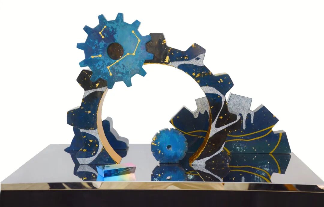 本次设计创作上在选用齿轮作为漆雕塑载体,是我对工业时代的一种衍生理解,让其摆脱冰冷呆板的传统固有印象,将其进行重新拆分重组,再在底座上排列组合。构成上利用繁星和齿轮相结合的形象来构造一个意象场景,以蓝色的基调为主,整体以营造出星空夜晚浩瀚无垠的氛围来突出现当代对工业时代的一种宁静与浪漫的艺术思考。
