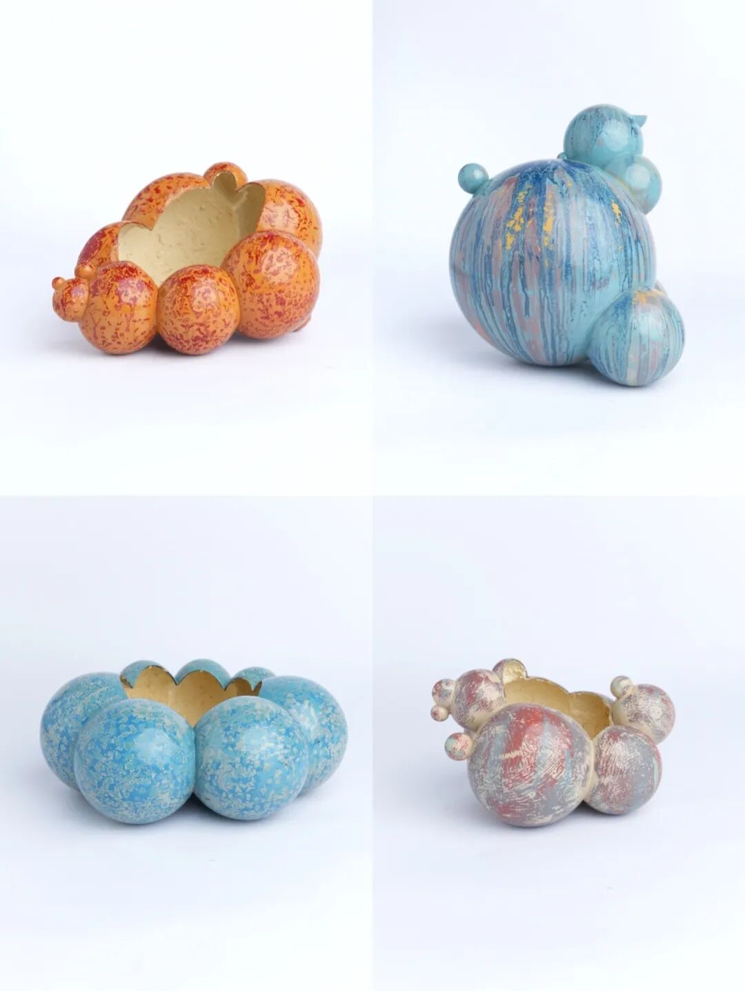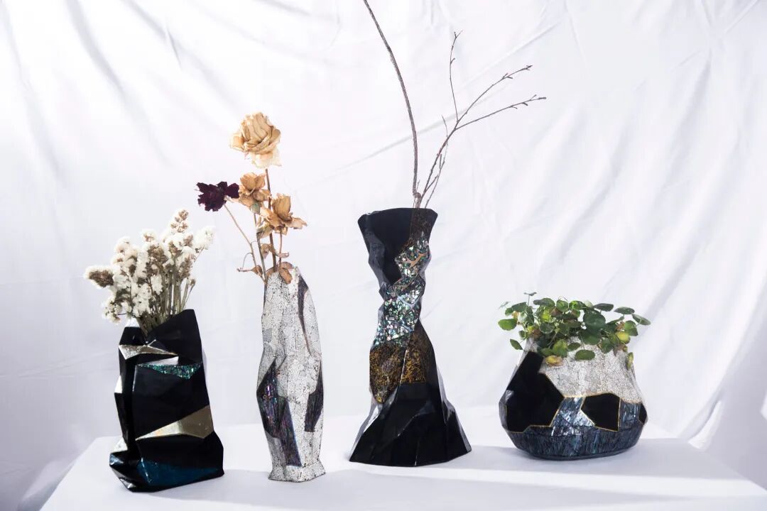 本作品灵感来源于多肉和仙人掌等热带植物,体现宗旨:花器合一,物我同修。本作品一共四个,两个采用的技法是打捻做肌理,圈圈圆圆的图案与风格,也很像多肉的特色,然后另外两个采用了泼漆的技法,漆自然流动下来的感觉也很像仙人掌类热带植物的感觉,真正做到运用素材体现主题。因为颜色上和技法体现上有不足,所以选择种植仙人掌和多肉来完整我的设计作品,作品体现植物生机勃勃的感觉,植物也让作品看起来更加完整,好看,正所谓是,花器合一,物我同修。