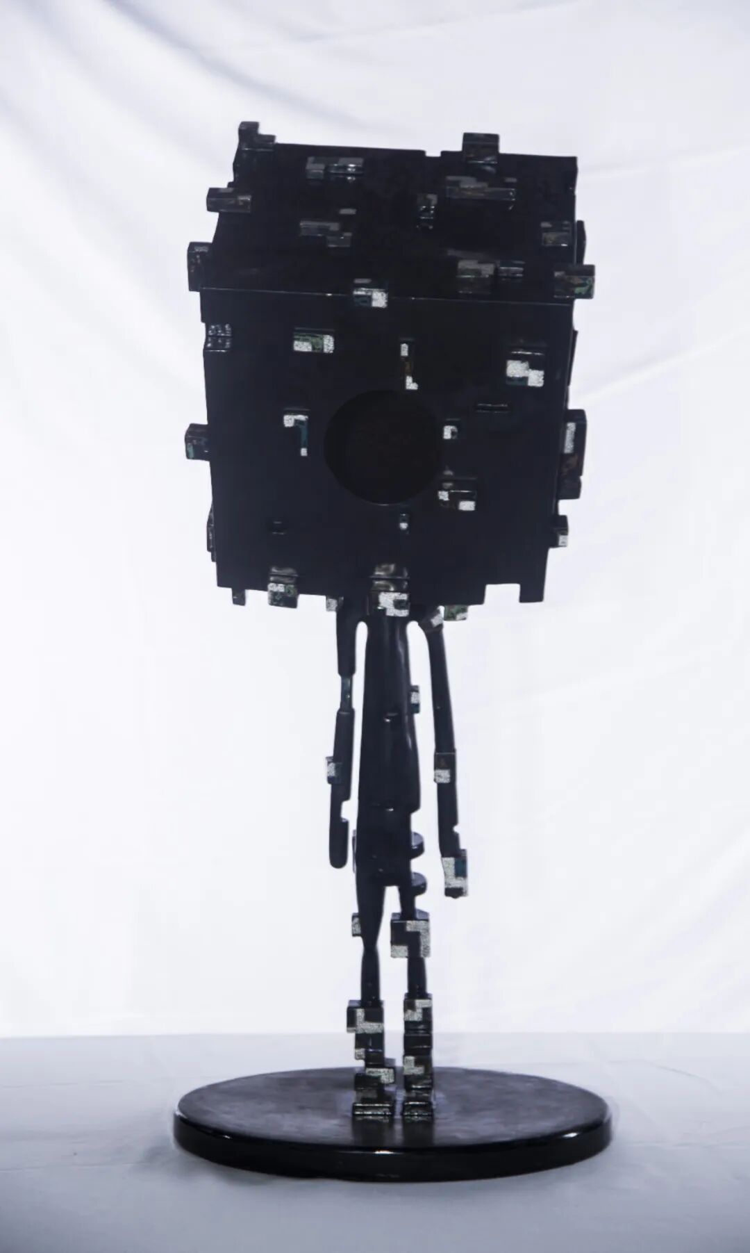 作品主题为对于明知道语言暴力会对他人造成不可逆转的伤害,却有不少人还会怀抱着“反正是在网上你能拿我怎么办”的心态在网上发表一些具有攻击性的言论以及讨论家庭长期语言暴力对孩子的成长造成的伤害。通过机械臂来回运动来控制的“眼睛”来模仿喜欢发泄自己情绪的语言暴力者在寻找下一个受害者的情况,又采用火焰灼烧大漆和对漆灰进行按压拉扯的艺术手法将主体镂空流水图案的木质柜描述成一个长期饱受语言暴力伤害的受害者形象。旨在提醒大家注意自己的言行,学会非暴力沟通,不要在不经意间也成为了语言暴力的施暴者。
