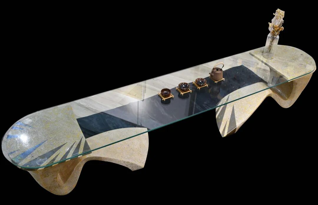 这套茶桌主要设计部分在于两只桌脚的造型,并且是单独与桌面分开的。两只桌腿的造型是一致的,通过对茶山的观察,运用简洁的线条提取山脉的形态,在与桌面衔接处运用到的设计灵感是来自于茶叶在捻茶时茶叶的形态特征,茶叶是弯曲形的,与山脉的连绵起伏有相呼应的地方,所以整体桌脚的造型通过山脉的起伏以及捻茶时茶叶的形态相互衔接而成,两者的结合主要以弯曲的线条为主,在与桌面街接设计了一个平台,宽度有45cm,方便用于与桌面进行支撑,桌面采用钢化玻璃的材质,选择玻璃材质的重点时是既有通透又有些反射的感觉,可达到透过桌面欣赏到桌脚的部分,同时可以反射出桌脚上的肌理,在品茶的同时,更切身的感受整体茶桌对于茶文化的抒发。