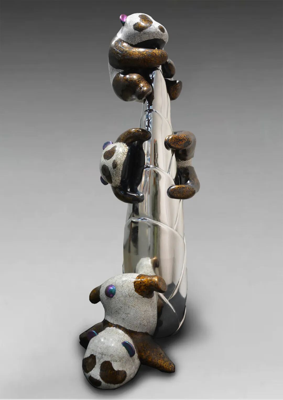 将大熊猫的动态进行多次创作,使熊猫动态引人喜爱,其中加入竹笋这一元素结合,同时大熊猫也别名竹熊,在创作当中用雕塑的方式对大熊猫的造型语言进行设计。将大熊猫与竹子的动态关系进行多次组合尝试,使熊猫动态引人喜爱。大熊猫也别名竹熊,其中加入竹笋这一元素提升作品的完整性,作品中采用大熊猫三个动态和竹笋相结合,用熊猫的可爱动态来激发出欣赏者对生态及环境保护主题的兴趣。以及大熊猫日益失去往日赖以生存的家园,熊猫紧抱竹笋唤起人们对环境的思考。