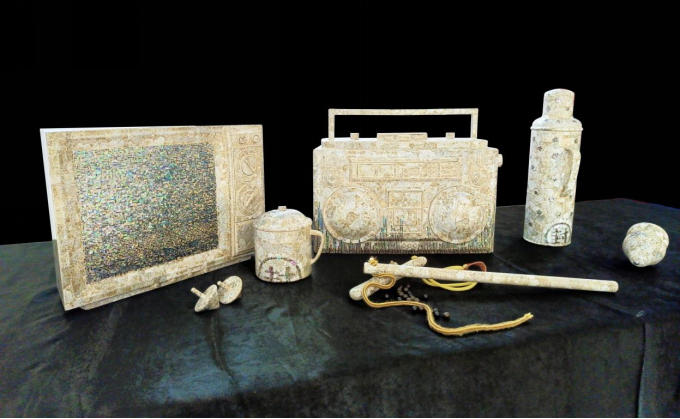 本次创作采用蛋壳螺钿的镶嵌技法,将搪瓷杯、热水壶、电视机、收音机用一个“封”字,联系起来,表达记忆被封存的意思。搪瓷杯、热水壶、电视机、收音机这些属于儿童时期的老物件,承载着那些时光里的烟火。再加上一些儿时玩具进行点缀,将思绪拉回到曾经那些简单、幼稚且无忧无虑的童年时光。感谢这些老物件,收纳着我千金不换的黄金岁月,都说恋旧的人,是时间的拾荒者,我愿做这时间的拾荒者,回到过去,拣选那些闪光的记忆碎片,打开那些美好且短暂的尘封的记忆。