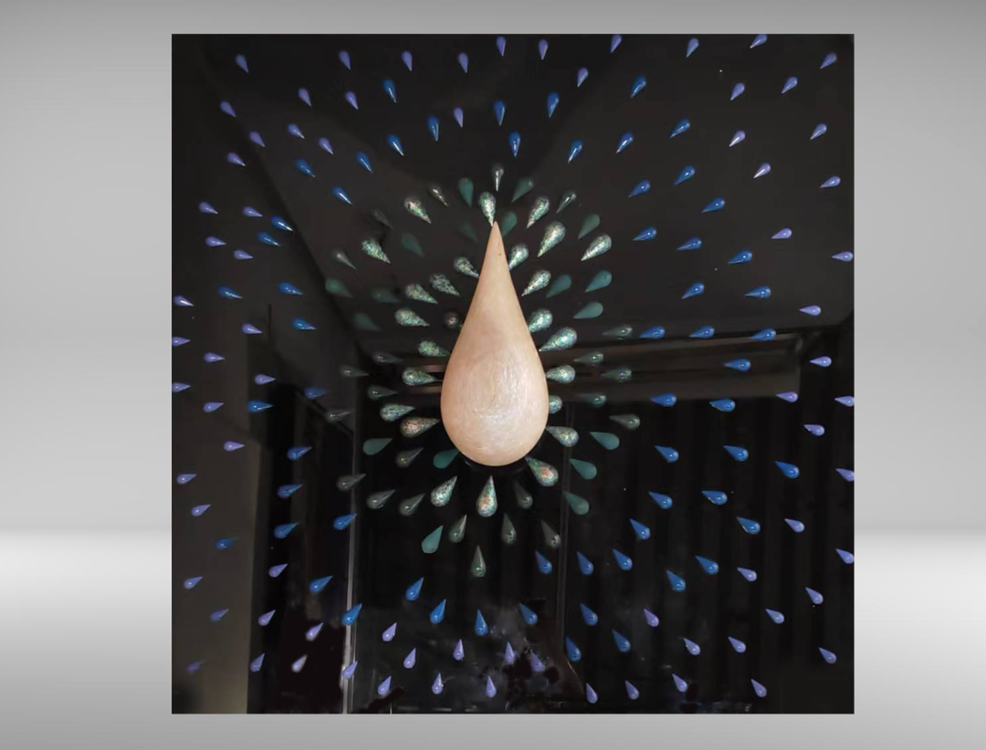 双手捧着渐渐圆满的作品,每一次髹涂打磨,加加减减中,我都可以得到片刻安宁,在流动的时间中,仿佛与周围短暂作别。我们呼吸吐纳轻呵其中,汗液与漆、灰交融,此刻的我们之一是否会永远留在作品之内。大水滴摆件与余下小水滴在髹饰技法上,我都遍贴螺钿与简单髹涂,再无其他技法。