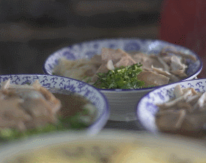 “手工压制的和乐条细腻、滑溜、清爽、筋道,配上味道醇浓的鸡汤卤,再点缀上金黄艳丽的鸡蛋皮、白生生的鸡肉丝、褐红香嫩的憨肉块、酸甜香脆的甜蒜片、翠绿清香的香菜梗和又香又红的辣椒油等佐料,可谓是色、香、味俱全……”