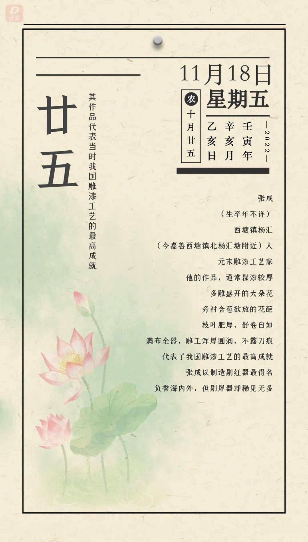 张成是元末杰出的雕漆工艺家,擅长制作剔红,光绪《嘉兴府志·嘉兴艺术门》记载: “张成、杨茂,嘉兴府塘杨汇人,剔红最得名。”
